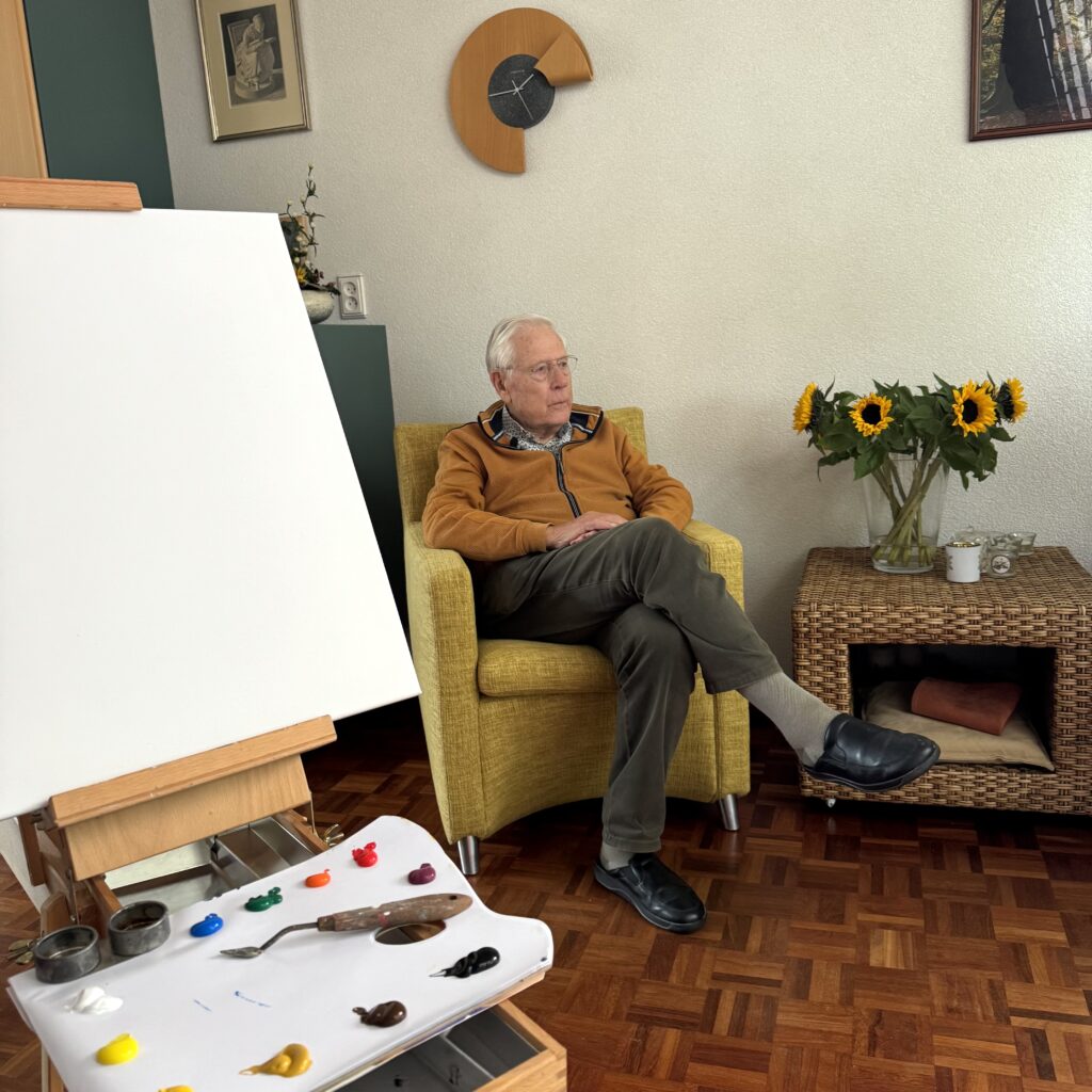 Hierbij kom ik met een videograaf en geluidstechnicus langs op locatie om het portret te schilderen van je dierbare en het interview op te nemen. Het is mogelijk om zelf je dierbare te interviewen, of ik kan dit doen. Ik heb een lijst met levensvragen die we in overleg kunnen aanvullen. In mijn atelier zal ik het schilderij afmaken en na afloop ontvang je een hoogwaardige video edit met de highlights uit het interview.